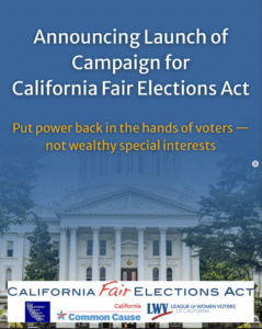 – Endorse and support The California Fair Elections Act (SB42) on the November 2026 General Election Ballot, that would remove the current prohibition of public financing of local government campaigns in California, while establishing basic requirements that public financing systems (and candidates using public funding) must follow to protect taxpayers and maximize the benefit to voters.